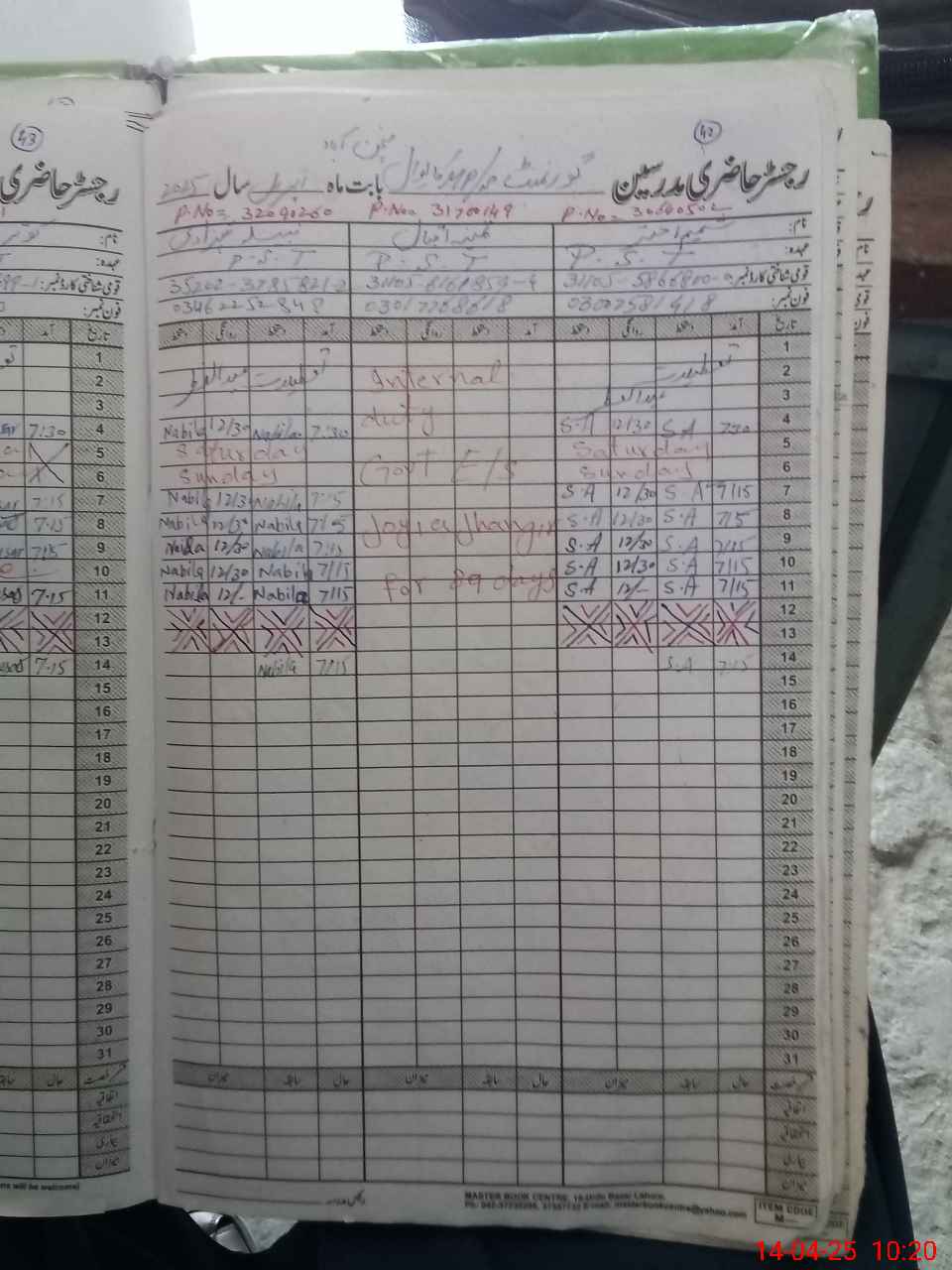 | CNIC | Full Name | Designation | R/C | Absence During Last Calender Month |