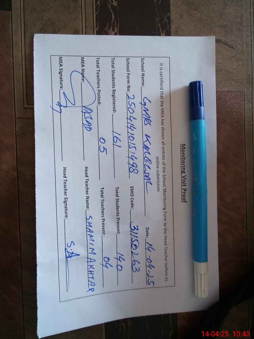 | Attendance Register | Head Teacher | MEA with School | Visit Proof |