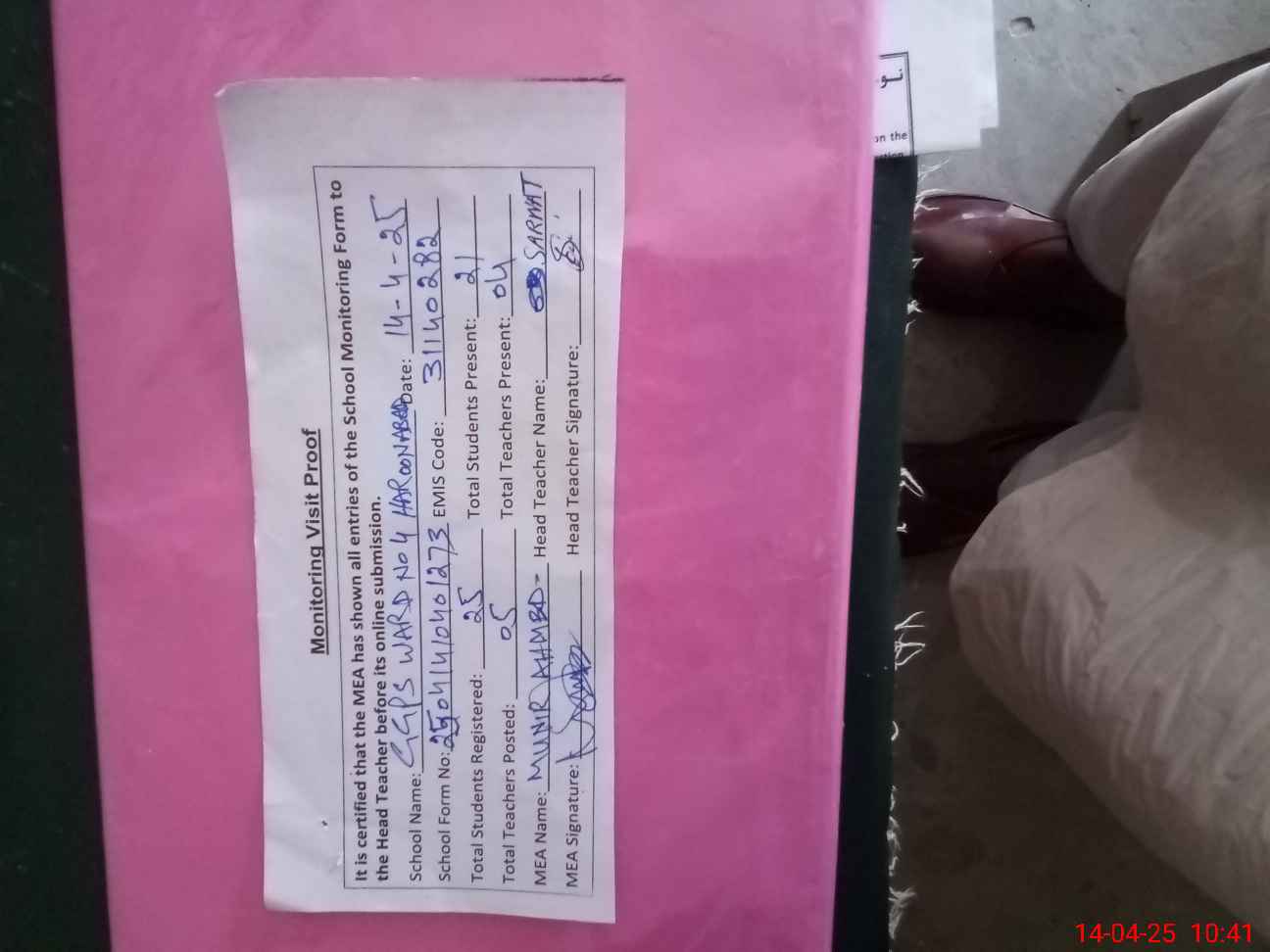| Attendance Register | Head Teacher | MEA with School | Visit Proof |