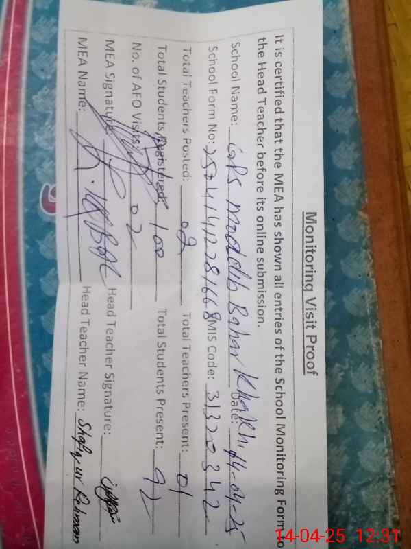 | EMIS Code: 31320342 | Name of School: GPS MOADIB BAHAR KHAKHI | |||