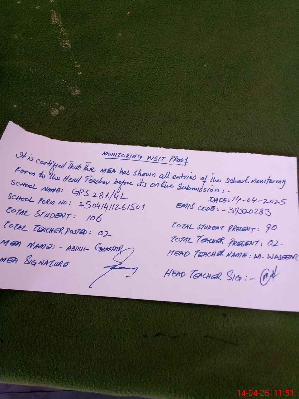| Attendance Register | Head Teacher | MEA with School | Visit Proof |