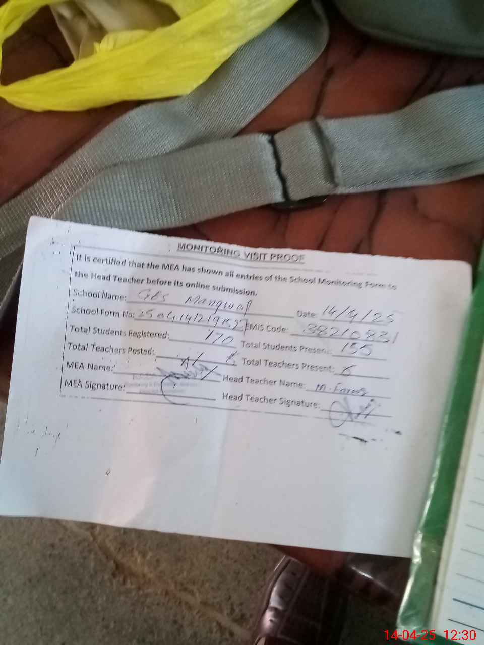 | Attendance Register | Head Teacher | MEA with School | Visit Proof |