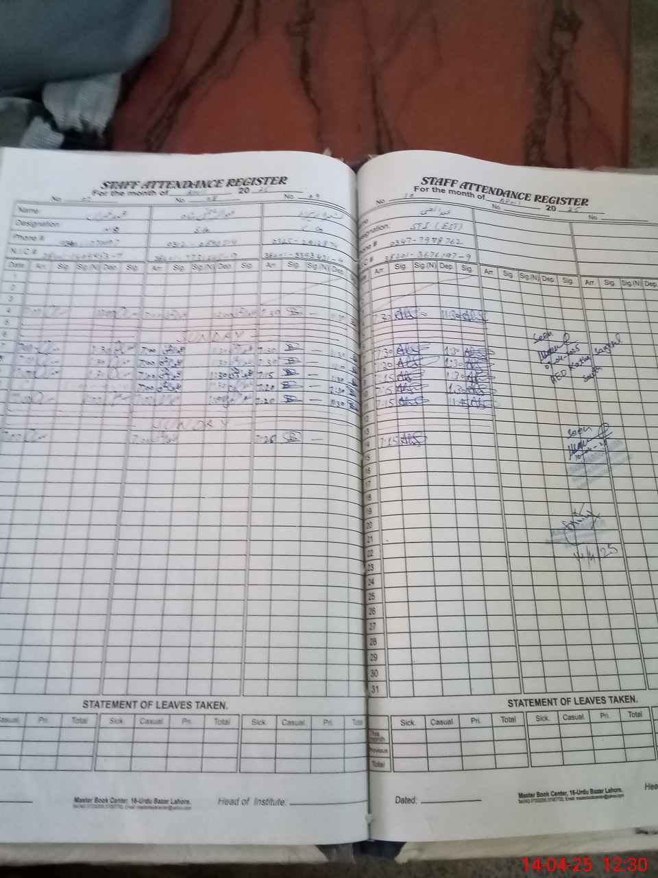 | CNIC | Full Name | Designation | R/C | Absence During Last Calender Month |