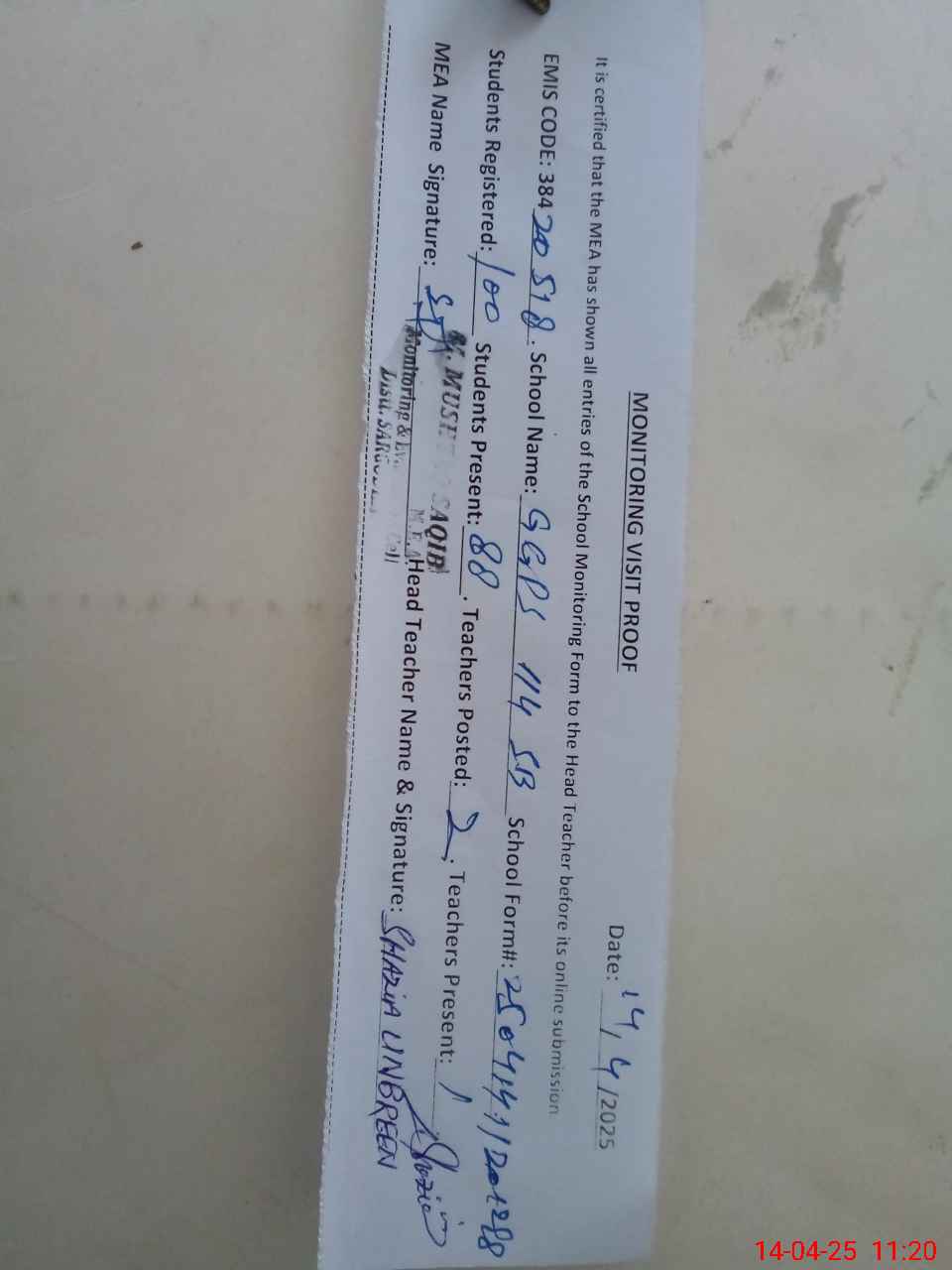 | Attendance Register | Head Teacher | MEA with School | Visit Proof |