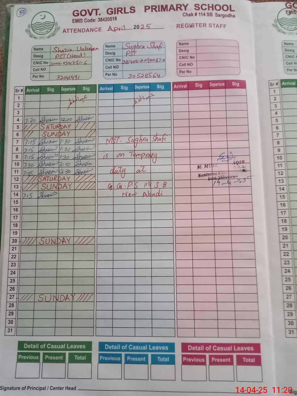 | Name: SH**** UN**** Designation: (School Headmaster's/Headmistress's) PST Phone/Cell Number: 03**** |