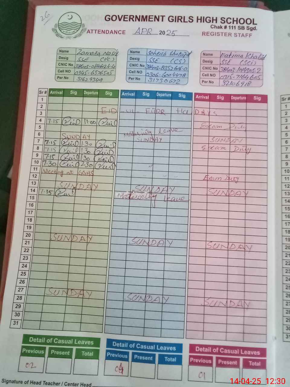 | CNIC | Full Name | Designation | R/C | Absence During Last Calender Month |