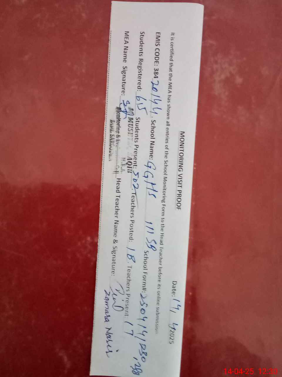 | Attendance Register | Head Teacher | MEA with School | Visit Proof |