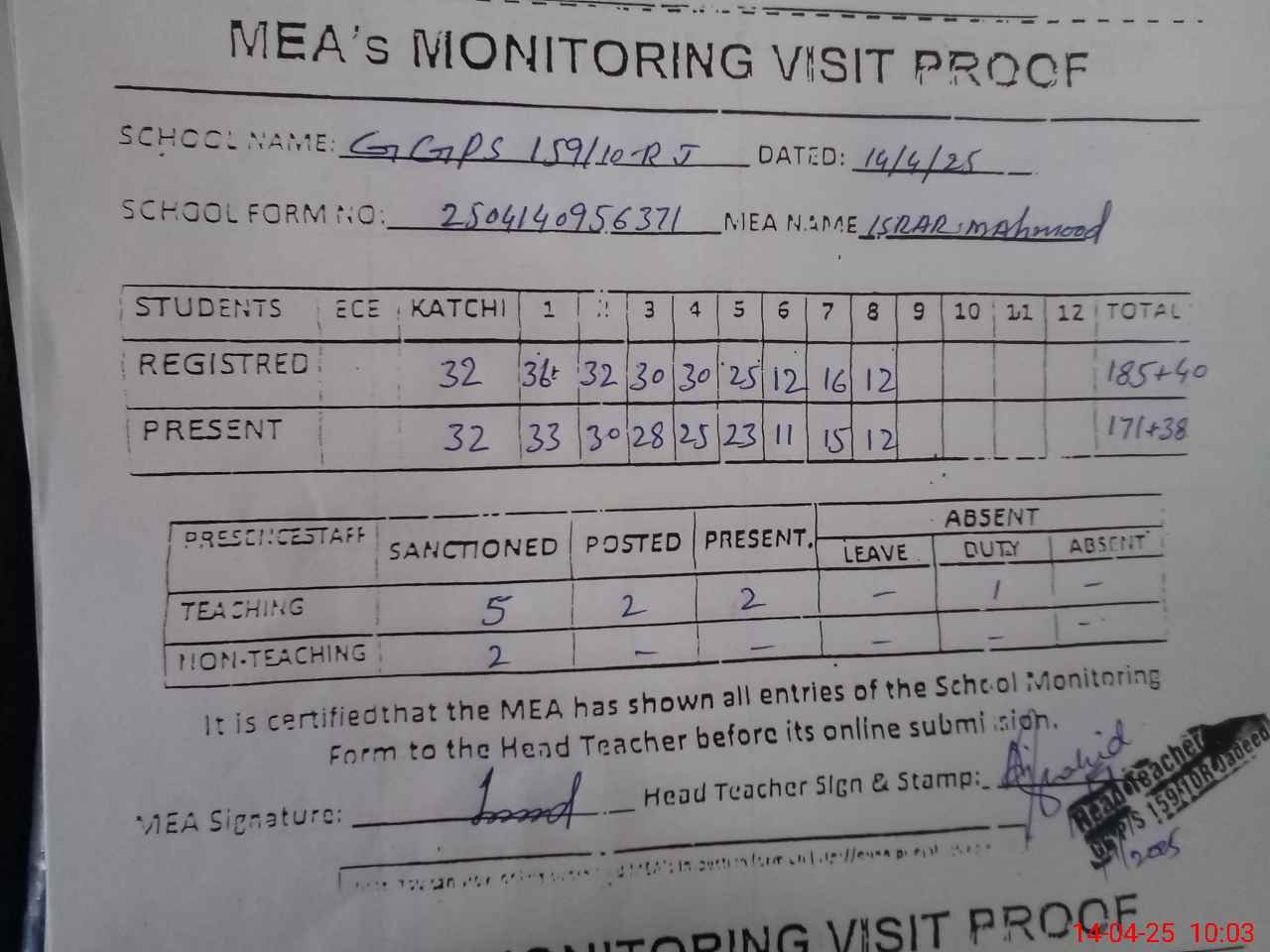 | Attendance Register | Head Teacher | MEA with School | Visit Proof |