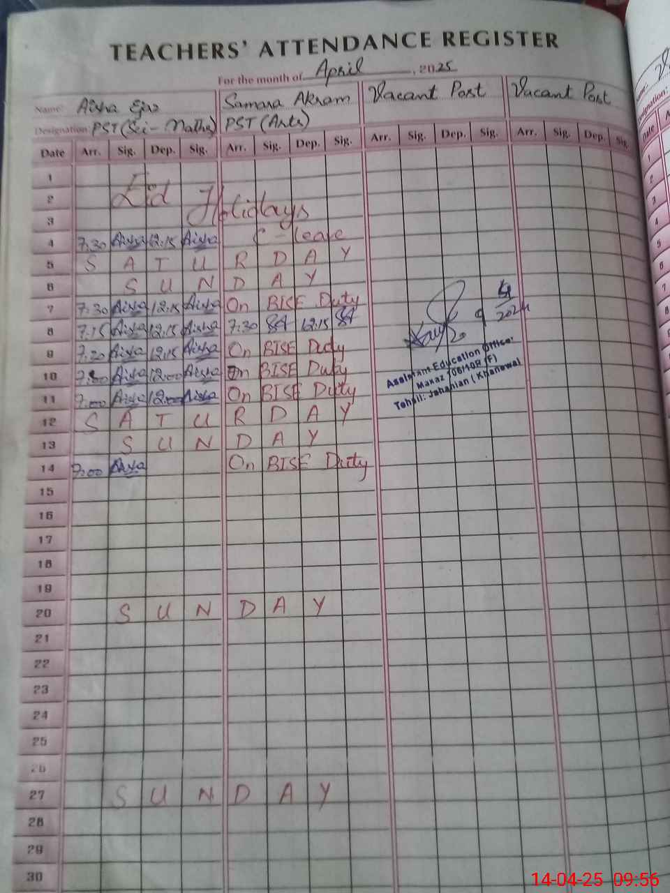 | 36**** | Sa**** Ak**** | 1 | 1 | 0 | 0 | 0 | 0 | 0 | 0 | 0 | 0 | 0 | Exam Duty |