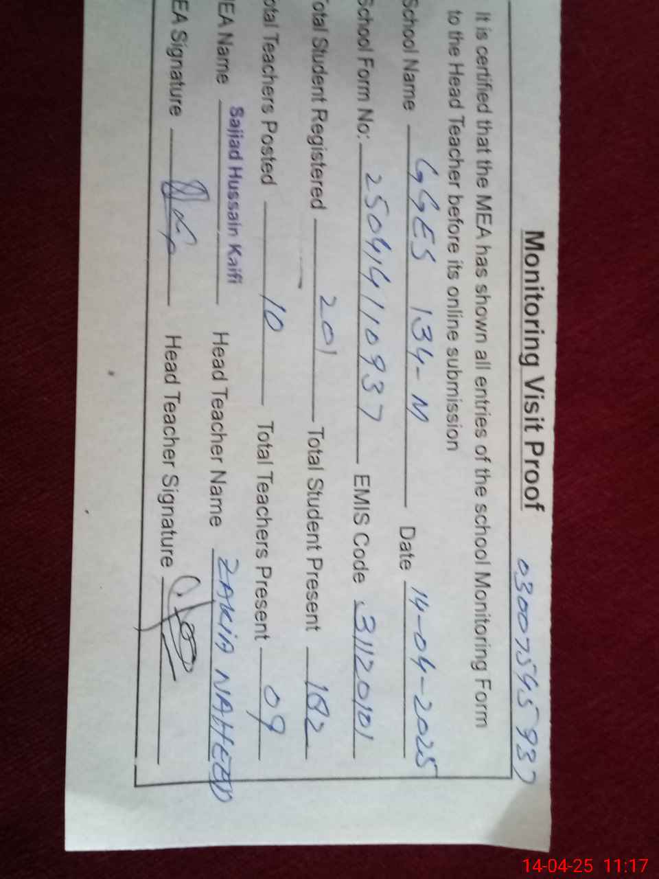 | Attendance Register | Head Teacher | MEA with School | Visit Proof |