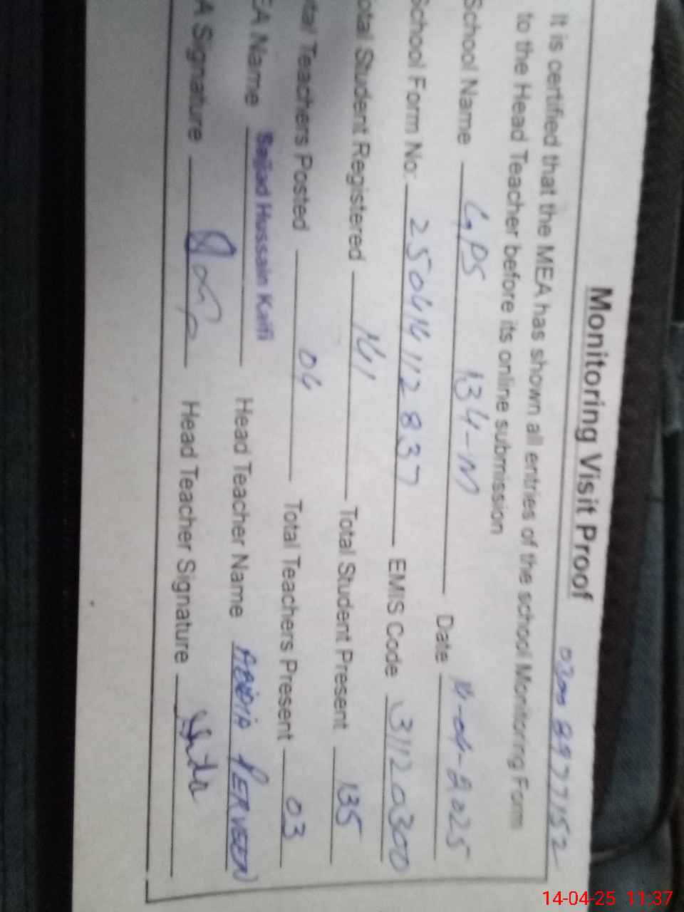 | Attendance Register | Head Teacher | MEA with School | Visit Proof |