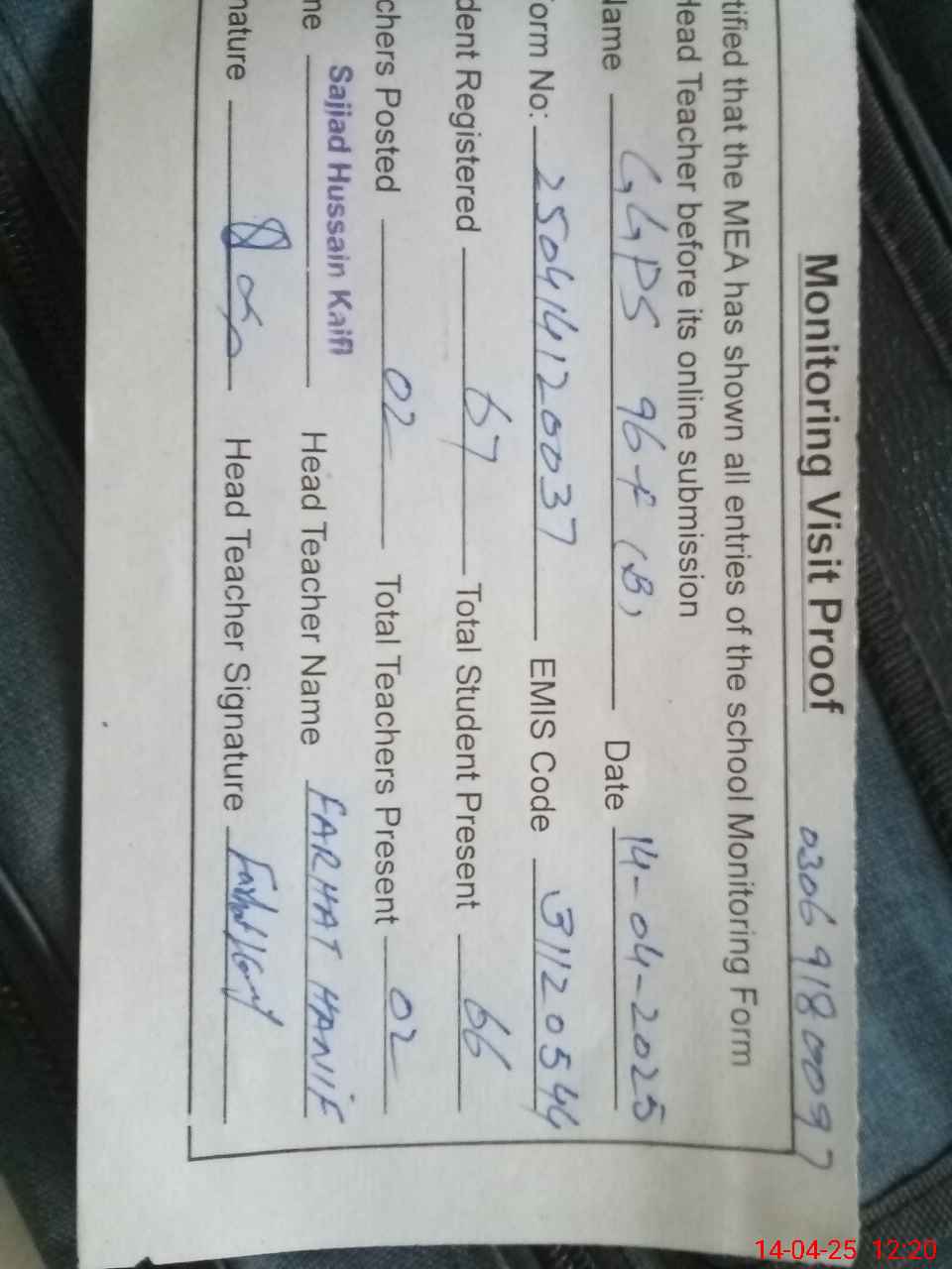 | Attendance Register | Head Teacher | MEA with School | Visit Proof |