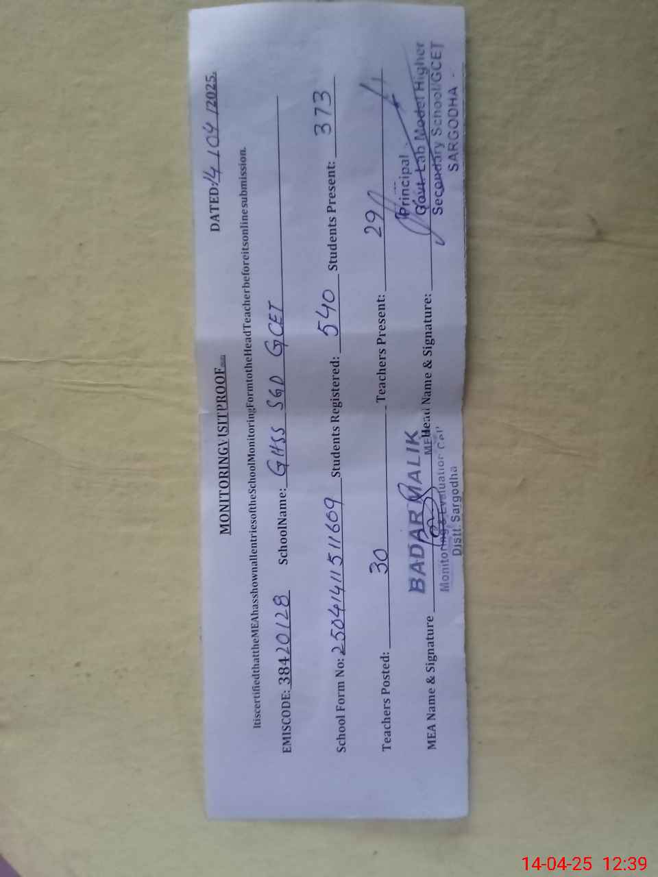 | EMIS Code: 38420128 | Name of School: GHSS SARGODHA (Old name GCET) | |||