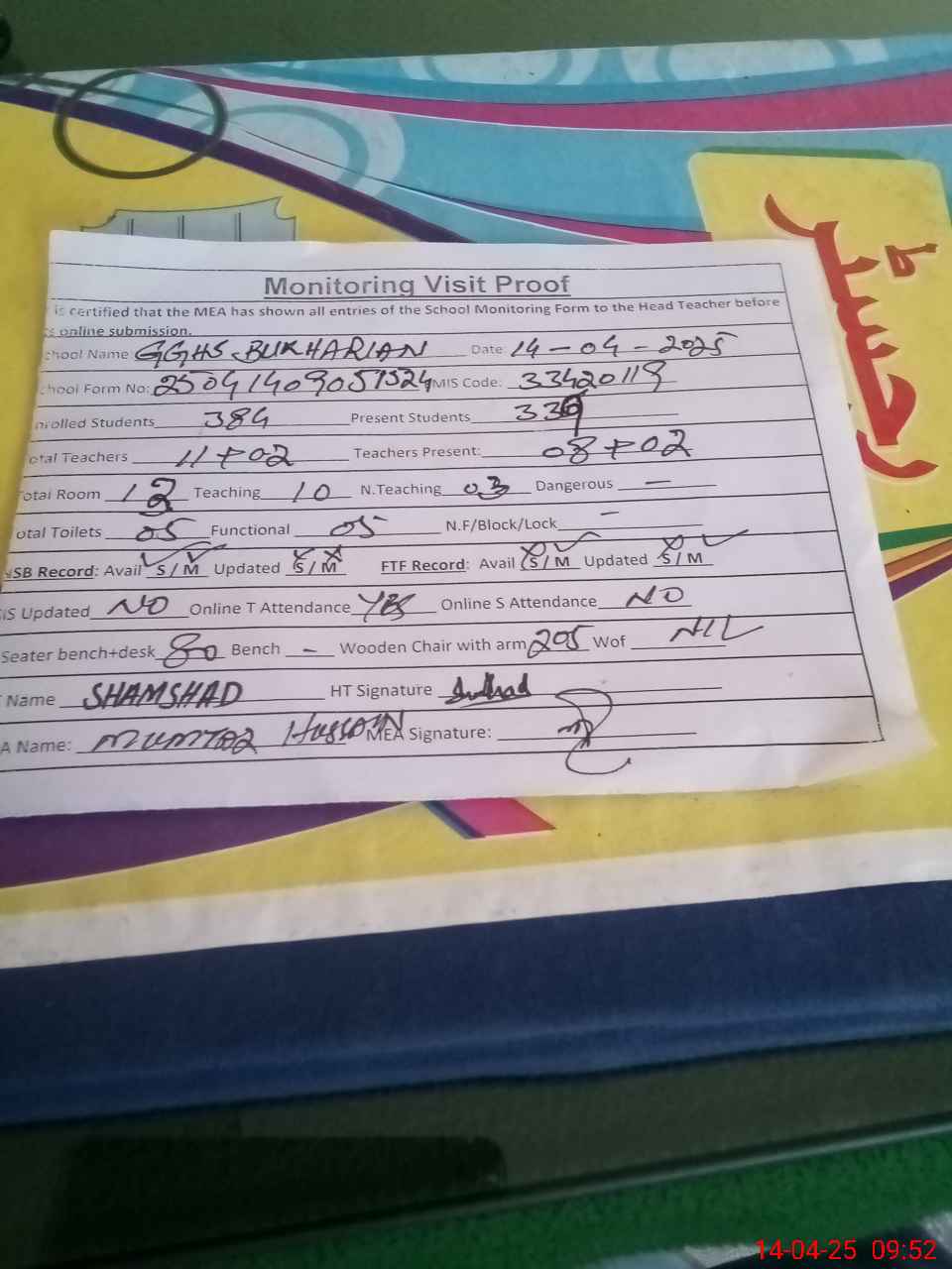 | Attendance Register | Head Teacher | MEA with School | Visit Proof |