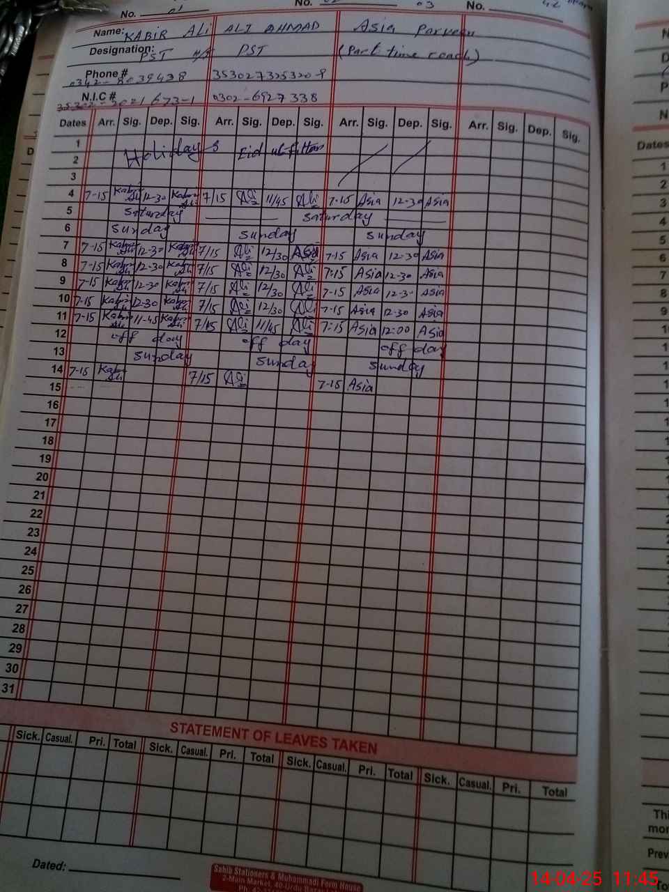 | CNIC | Full Name | Designation | R/C | Absence During Last Calender Month |