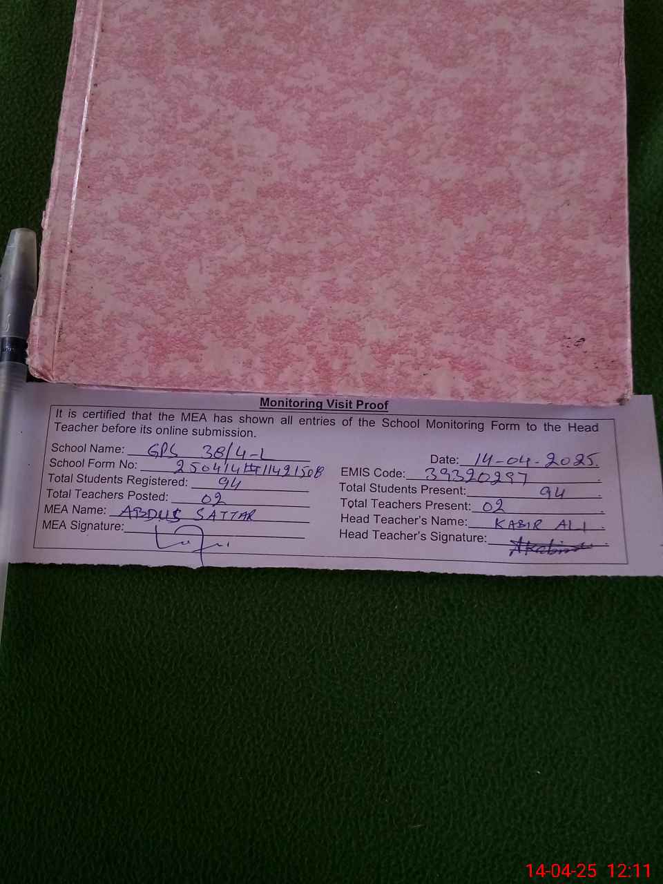 | Attendance Register | Head Teacher | MEA with School | Visit Proof |