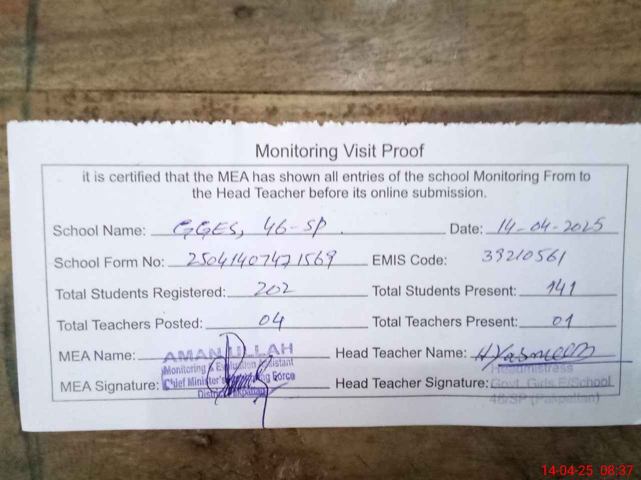 | Attendance Register | Head Teacher | MEA with School | Visit Proof |
