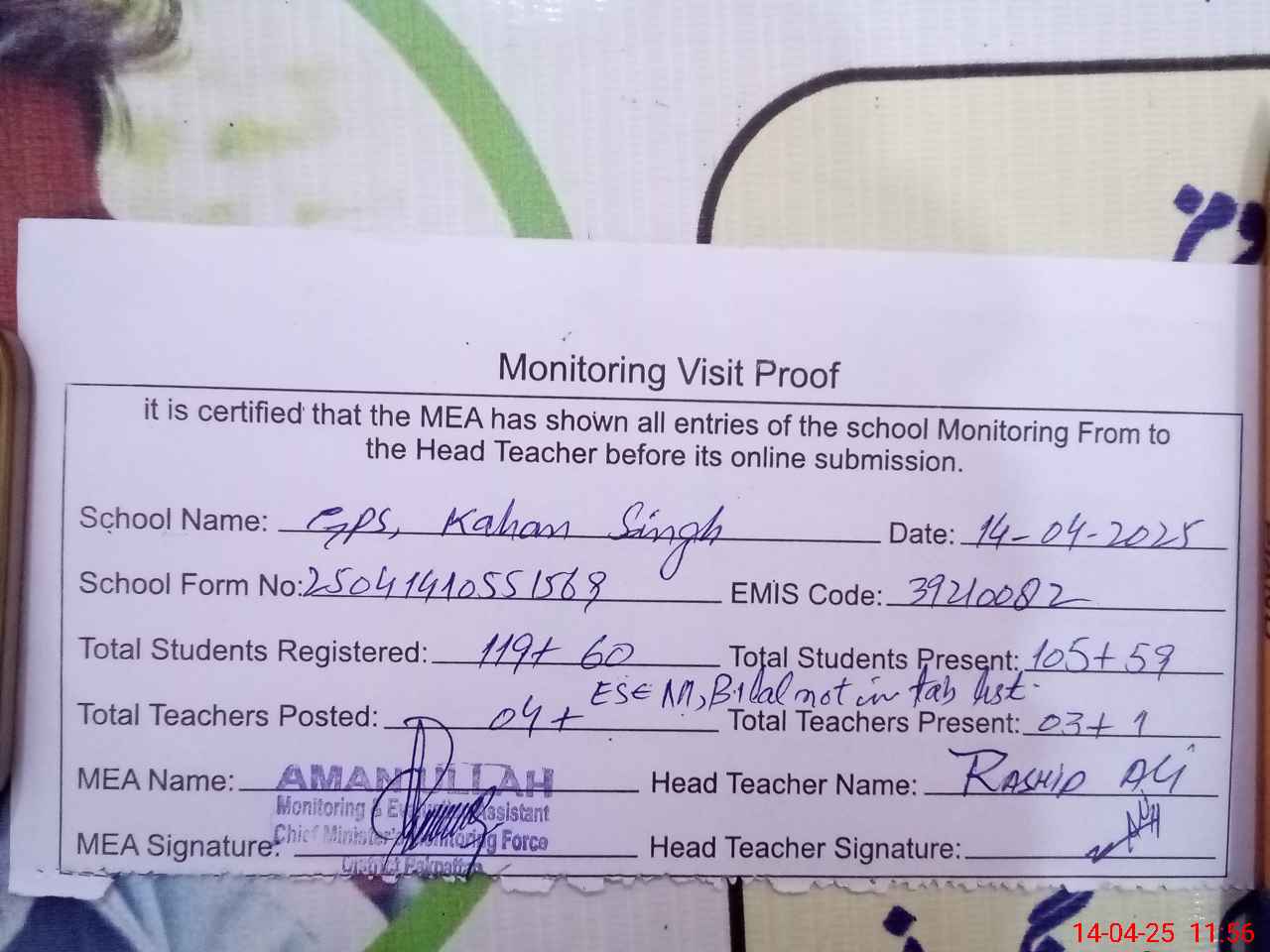 | Attendance Register | Head Teacher | MEA with School | Visit Proof |
