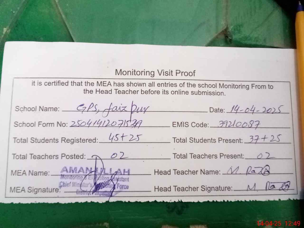 | Attendance Register | Head Teacher | MEA with School | Visit Proof |