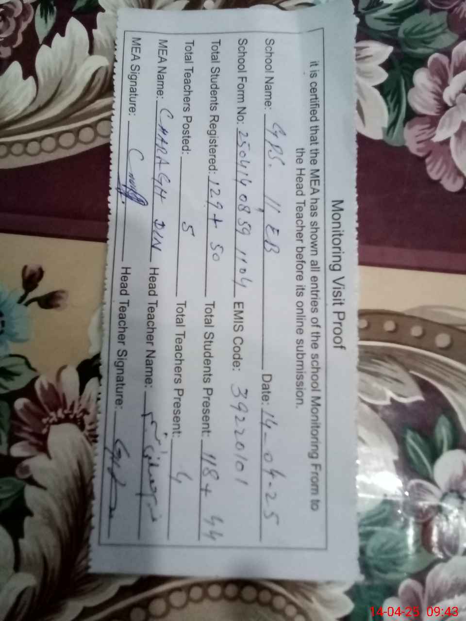 | Attendance Register | Head Teacher | MEA with School | Visit Proof |