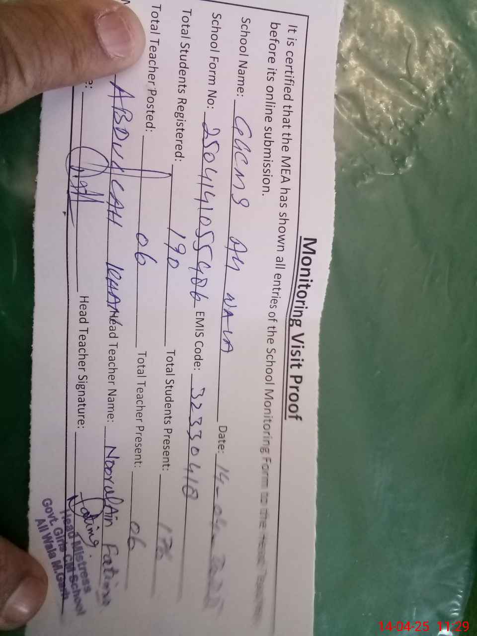 | Attendance Register | Head Teacher | MEA with School | Visit Proof |