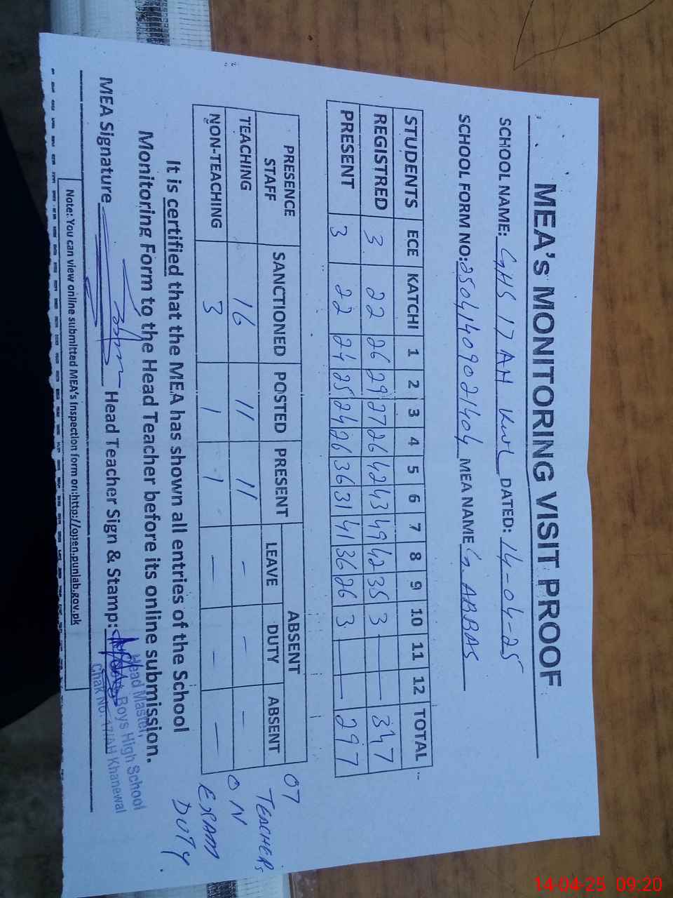 | EMIS Code: 36420067 | Name of School: GHS 17/AH, KHANEWAL | |||