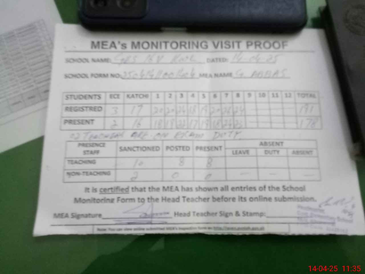 | Attendance Register | Head Teacher | MEA with School | Visit Proof |