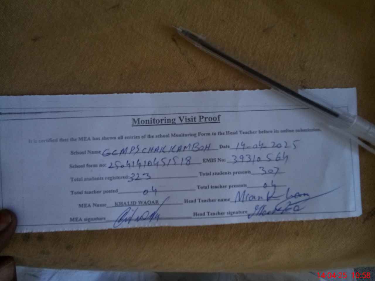 | Attendance Register | Head Teacher | MEA with School | Visit Proof |