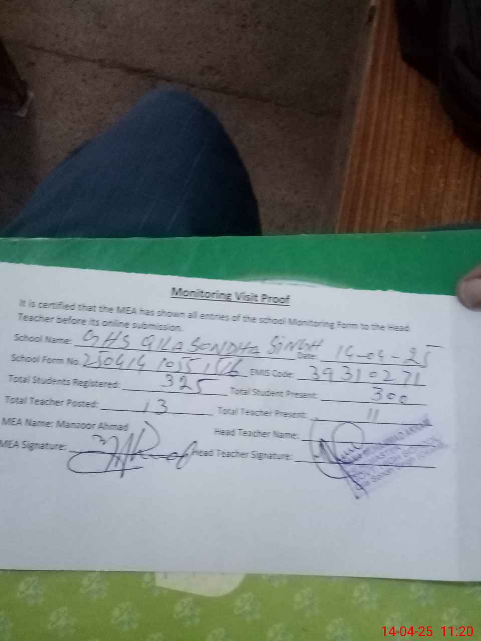 | Attendance Register | Head Teacher | MEA with School | Visit Proof |