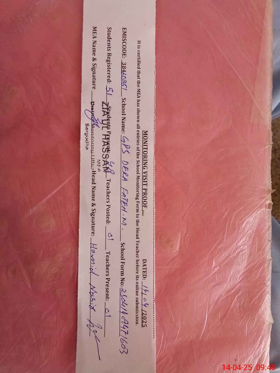 | Certified that this School was Inspected by the Undersigned MEA/DMO Today and the Information Stated Above is as Per Record. | |||||