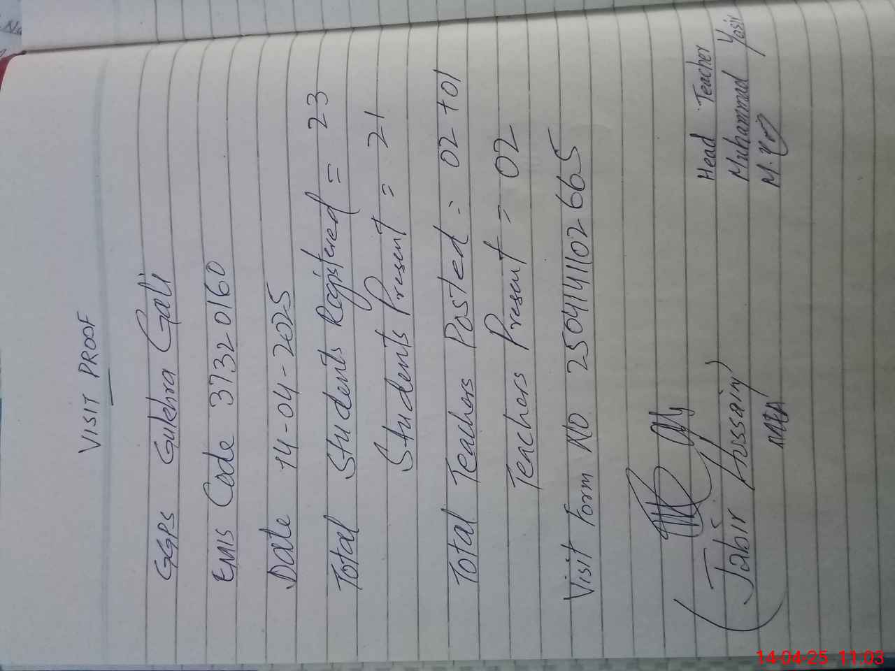 | Attendance Register | Head Teacher | MEA with School | Visit Proof |
