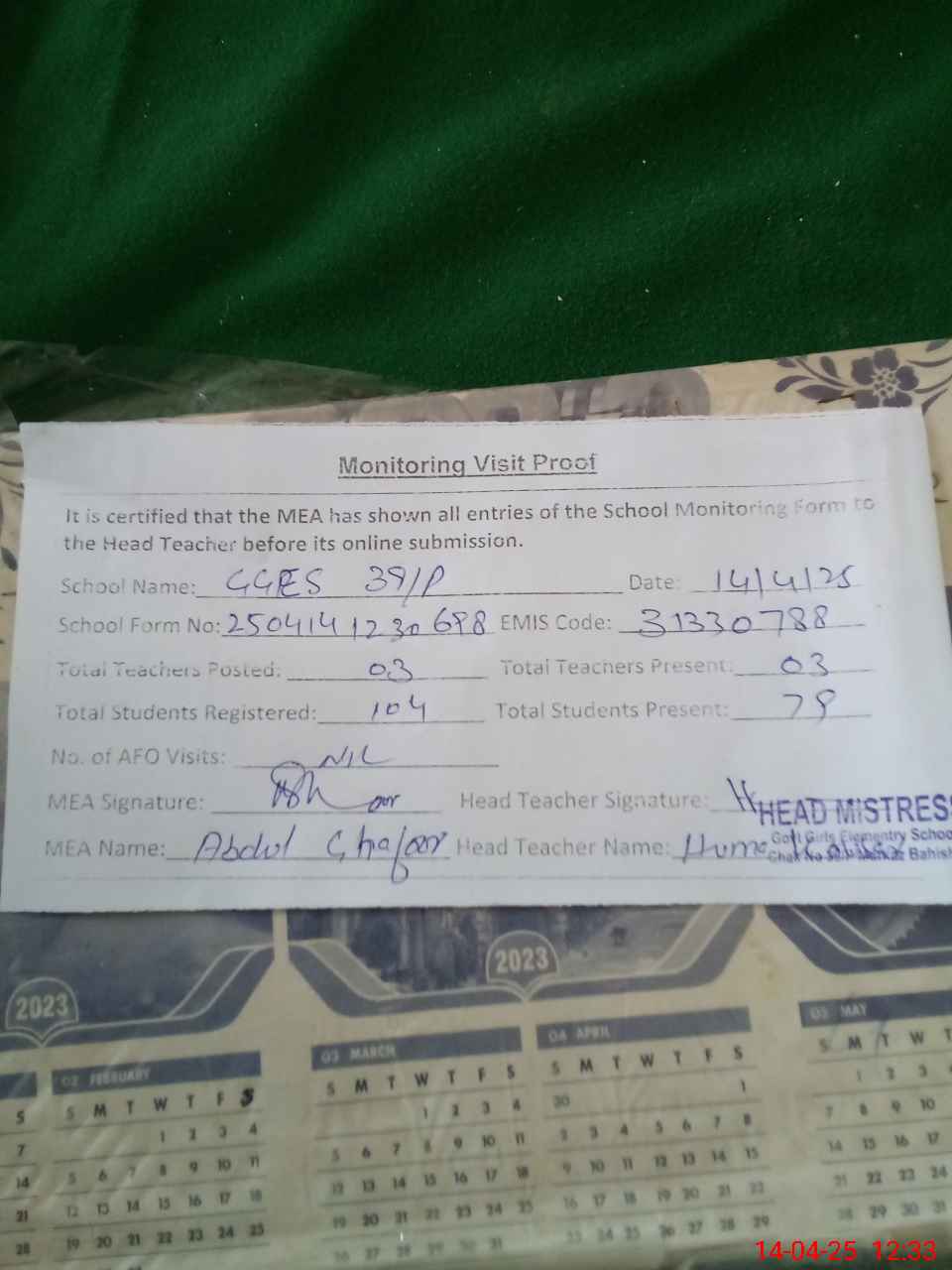 | Attendance Register | Head Teacher | MEA with School | Visit Proof |