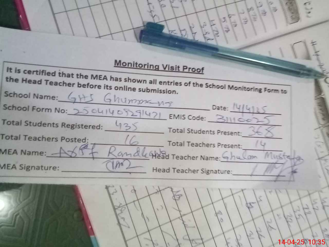 | Attendance Register | Head Teacher | MEA with School | Visit Proof |