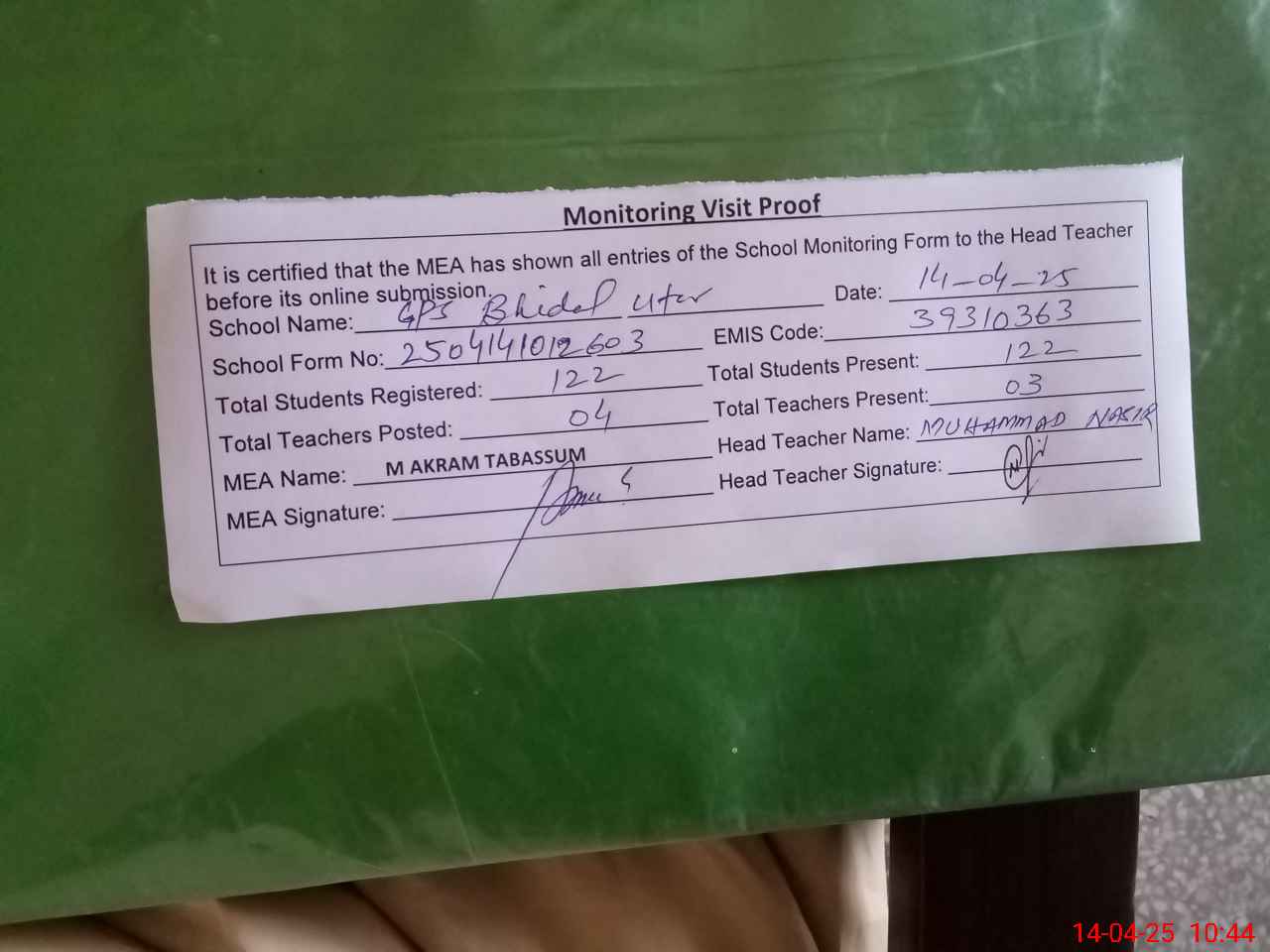 | Attendance Register | Head Teacher | MEA with School | Visit Proof |