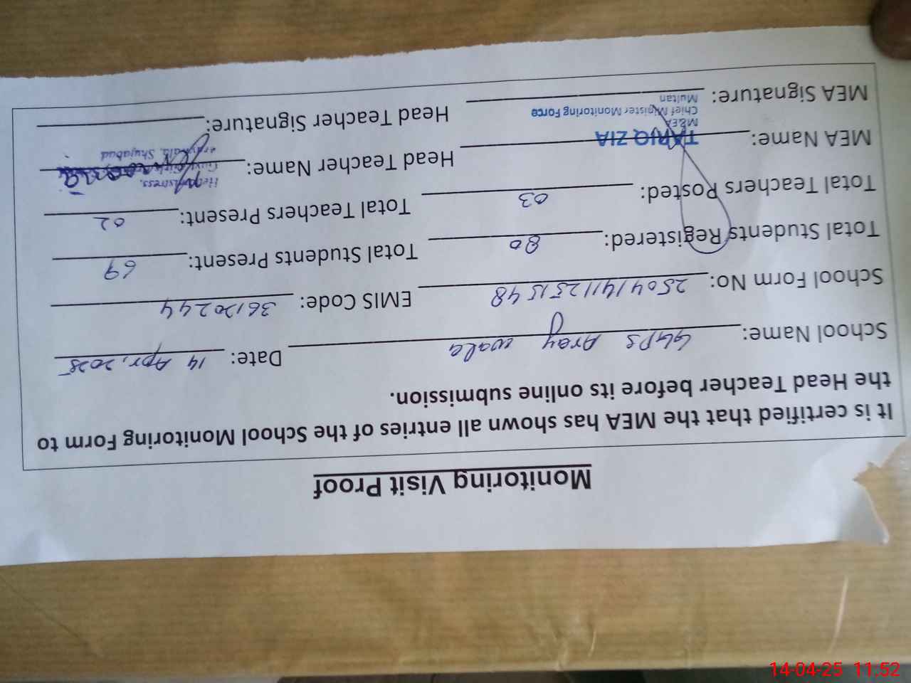 | Attendance Register | Head Teacher | MEA with School | Visit Proof |
