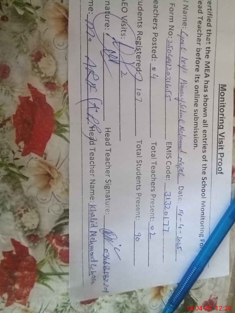 | Name: KH**** ME**** Designation: (School Headmaster's/Headmistress's) PST Phone/Cell Number: 03**** |