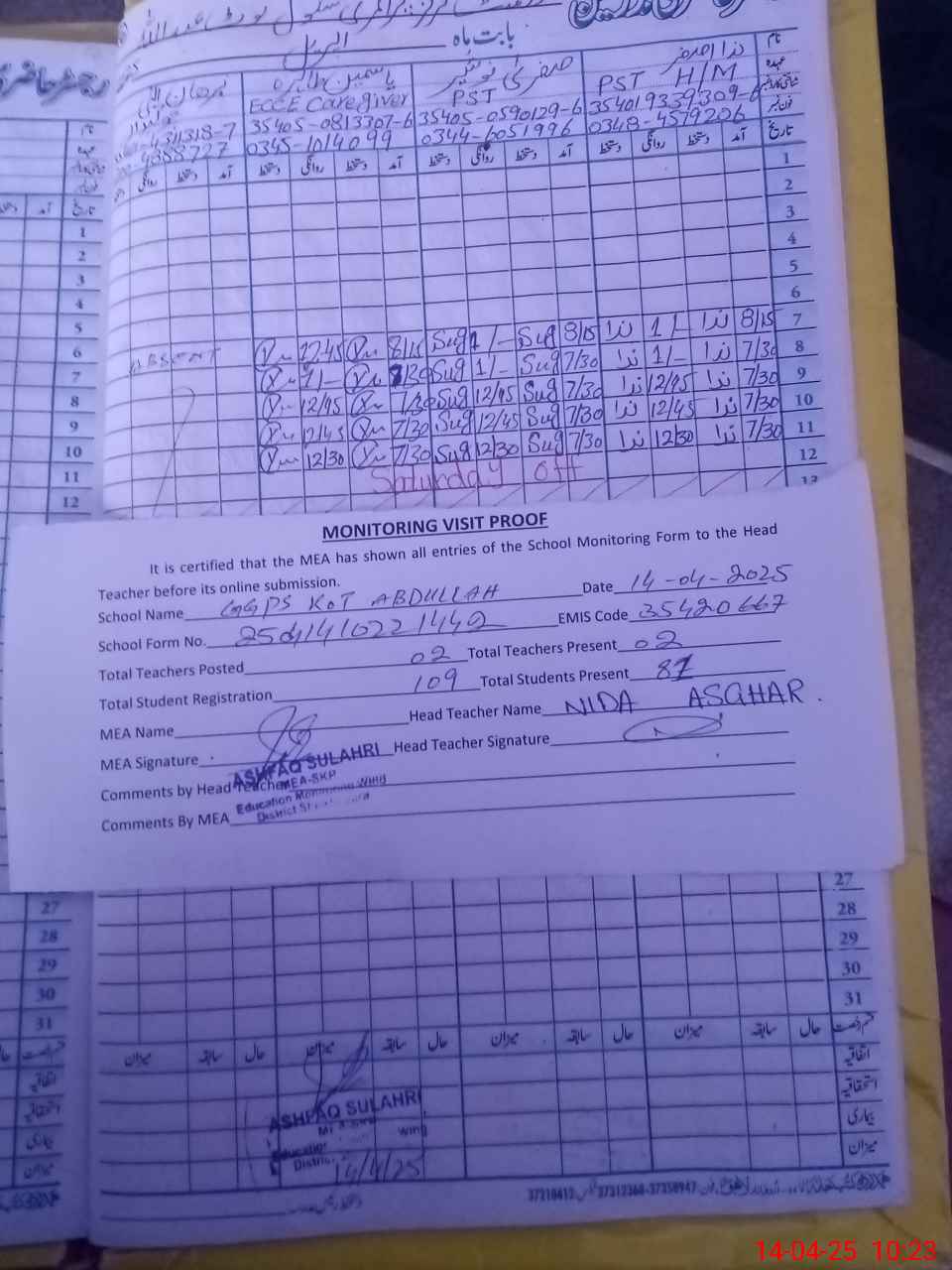 | EMIS Code: 35420667 | Name of School: GGPS KOT ABDULLAH | |||