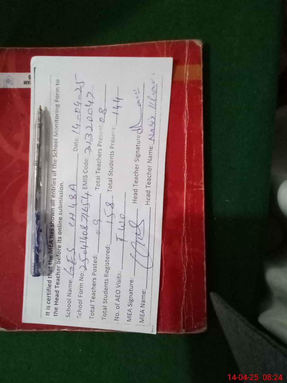 | Attendance Register | Head Teacher | MEA with School | Visit Proof |