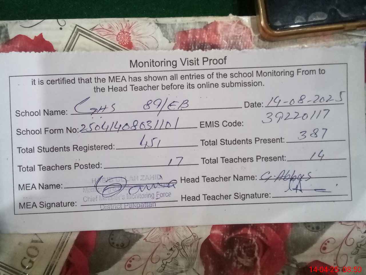 | Attendance Register | Head Teacher | MEA with School | Visit Proof |