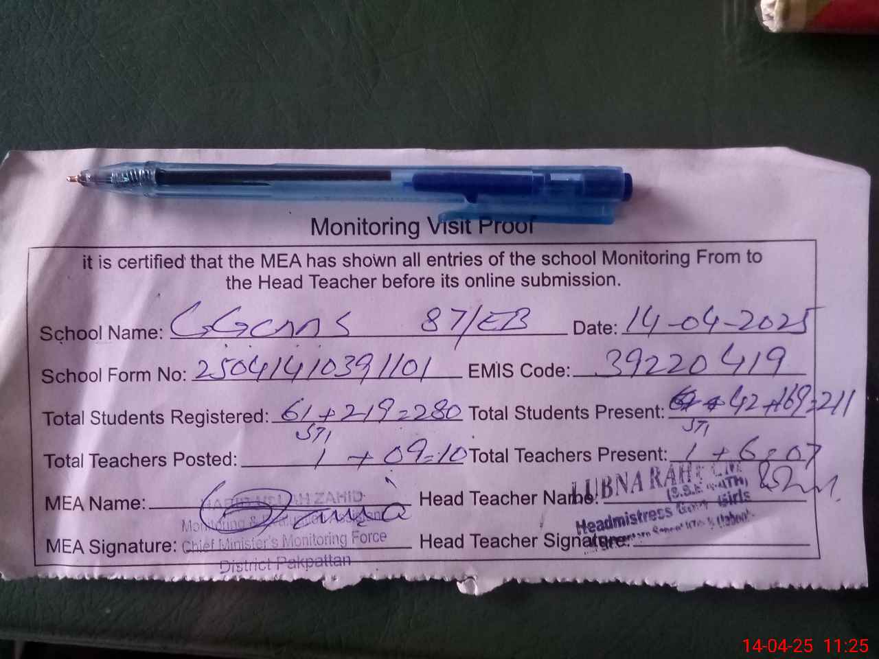 | Attendance Register | Head Teacher | MEA with School | Visit Proof |