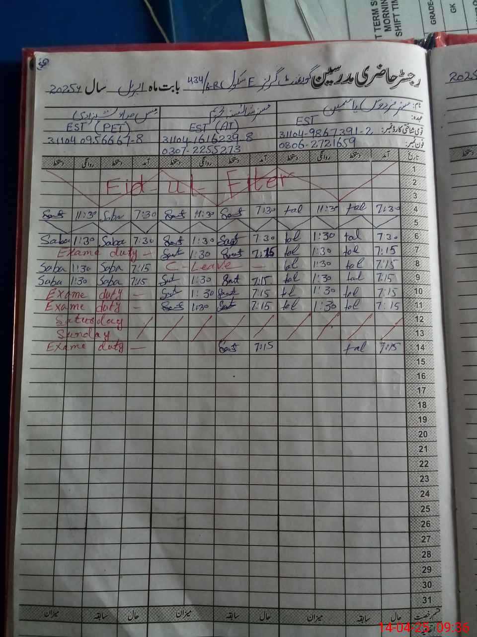 | 38**** | Ha**** Ul**** Kh**** | PET | Temporary | 0 | 0 | 0 | 0 | 0 | 0 | 0 | 0 | 0 | Exam Duty |