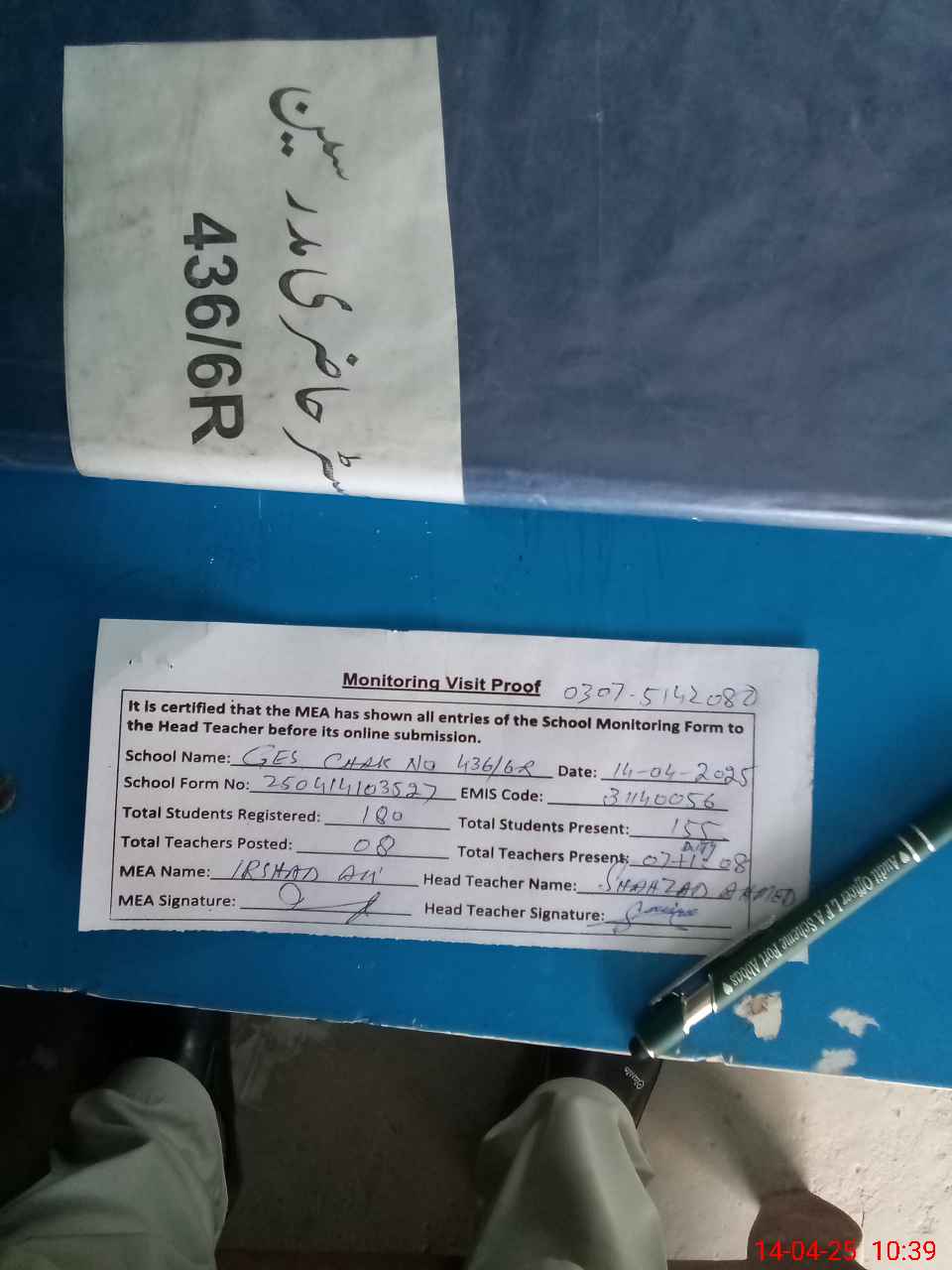 | Attendance Register | Head Teacher | MEA with School | Visit Proof |