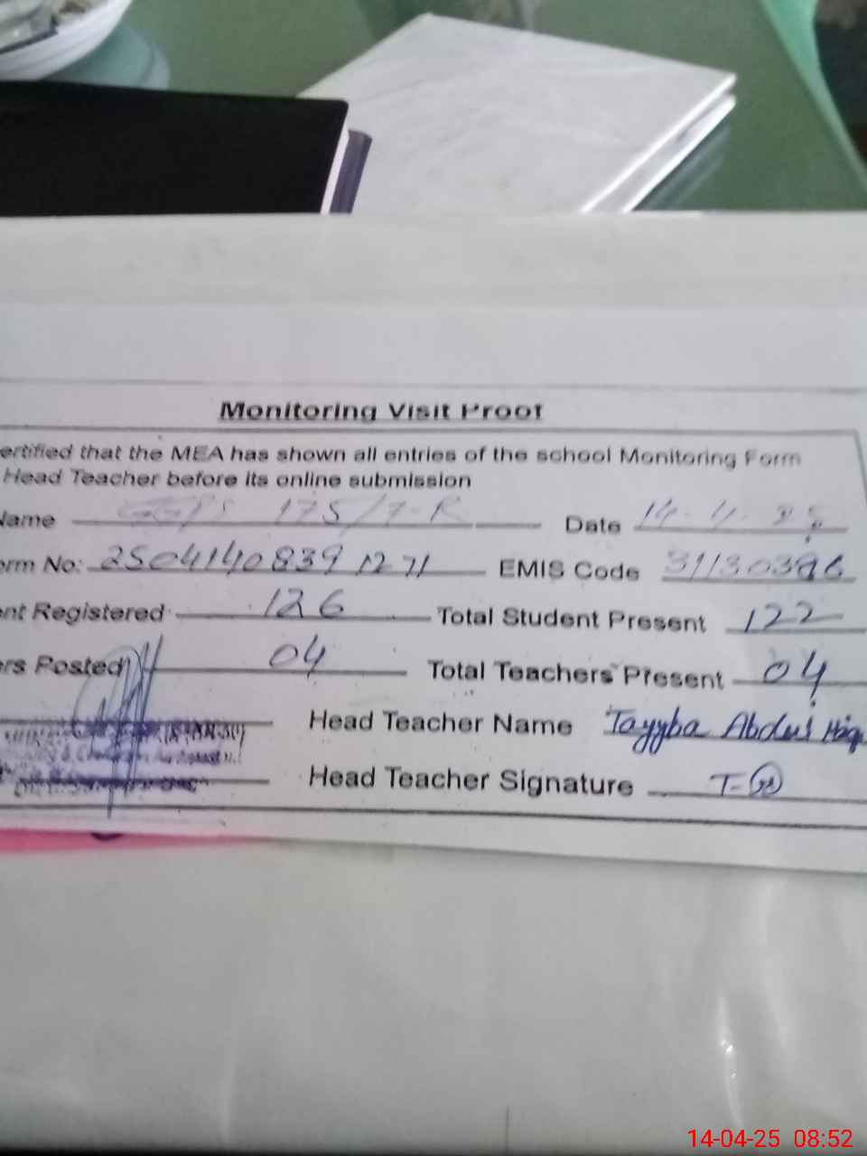 | Attendance Register | Head Teacher | MEA with School | Visit Proof |