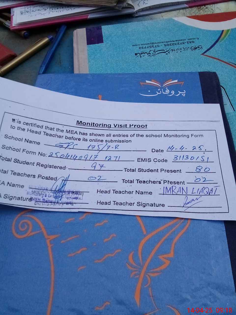 | EMIS Code: 31130151 | Name of School: GPS CHAK NO 175 7R SOUTH | |||