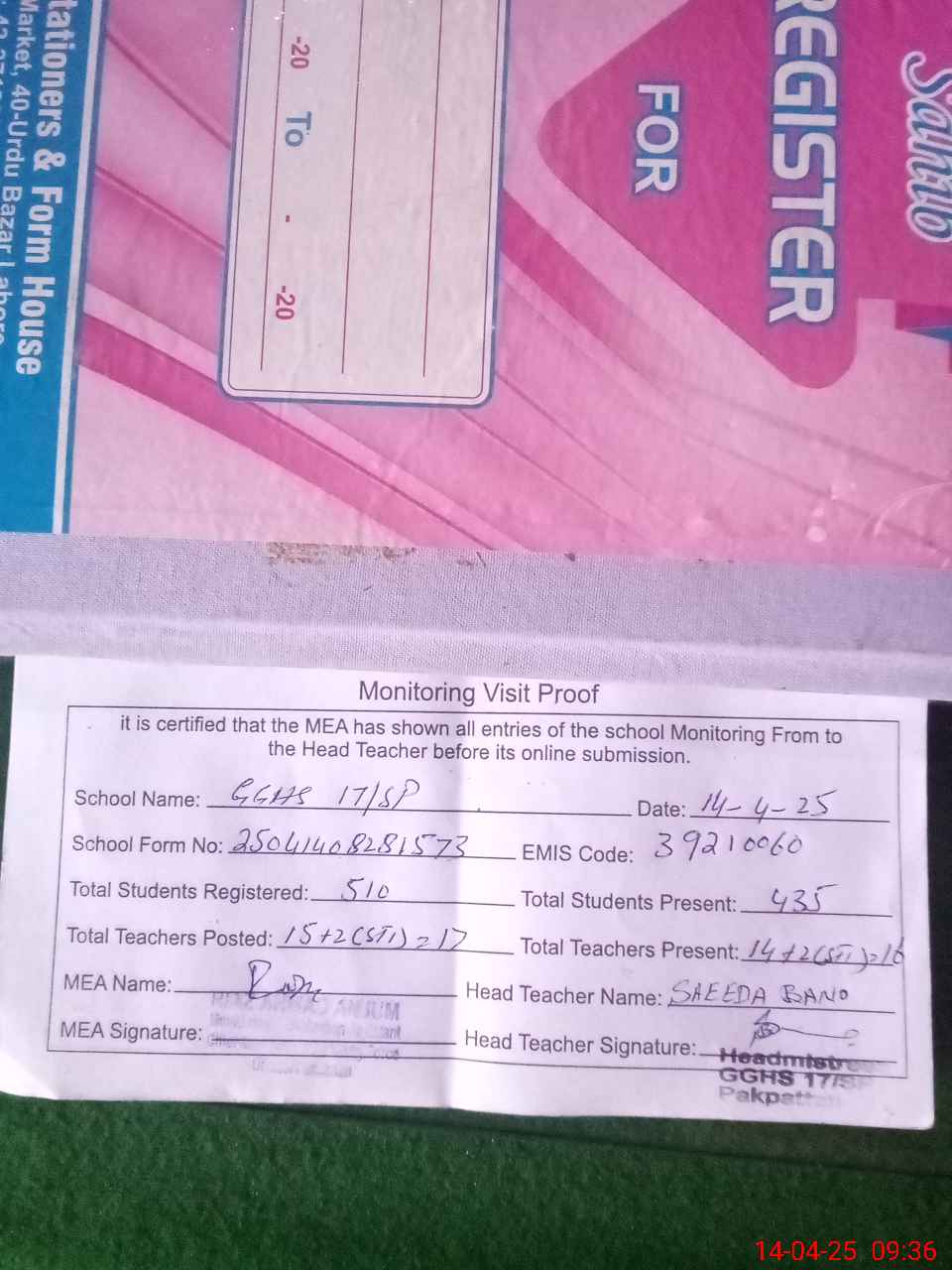 | EMIS Code: 39210060 | Name of School: GGHS 17/SP PAKPATTAN | |||