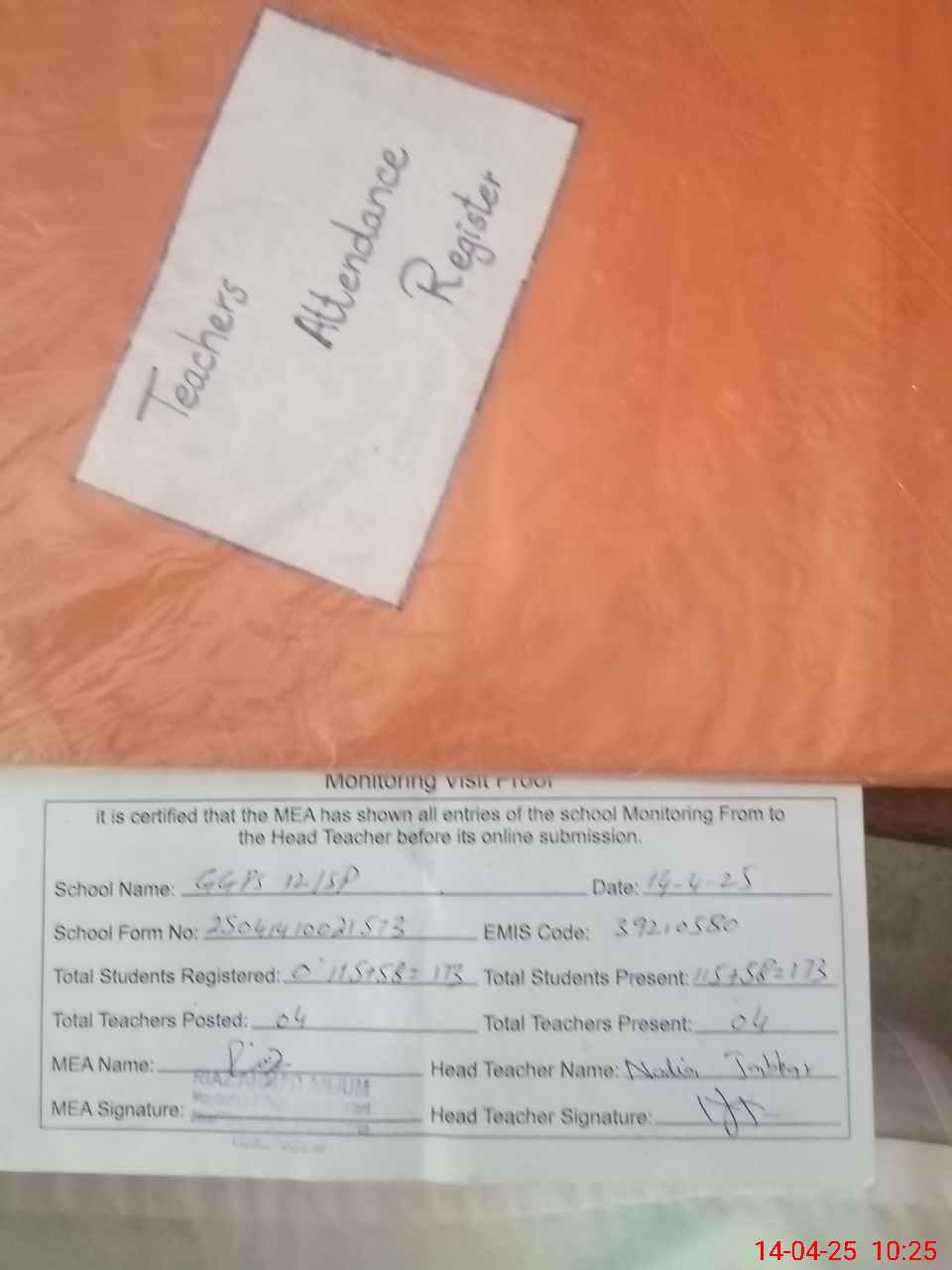 | Attendance Register | Head Teacher | MEA with School | Visit Proof |