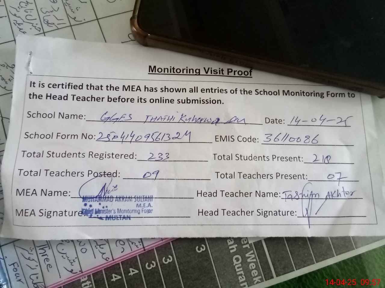 | Attendance Register | Head Teacher | MEA with School | Visit Proof |
