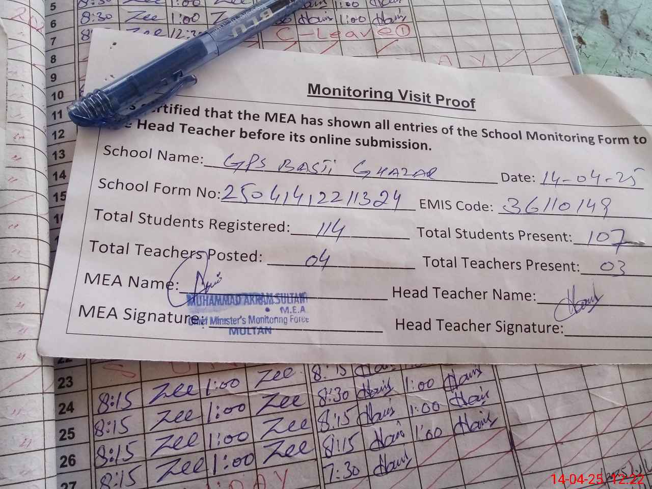 | Attendance Register | Head Teacher | MEA with School | Visit Proof |