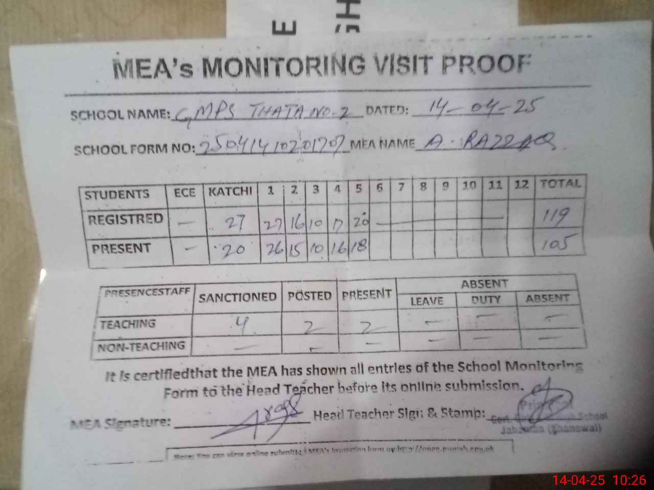 | Attendance Register | Head Teacher | MEA with School | Visit Proof |