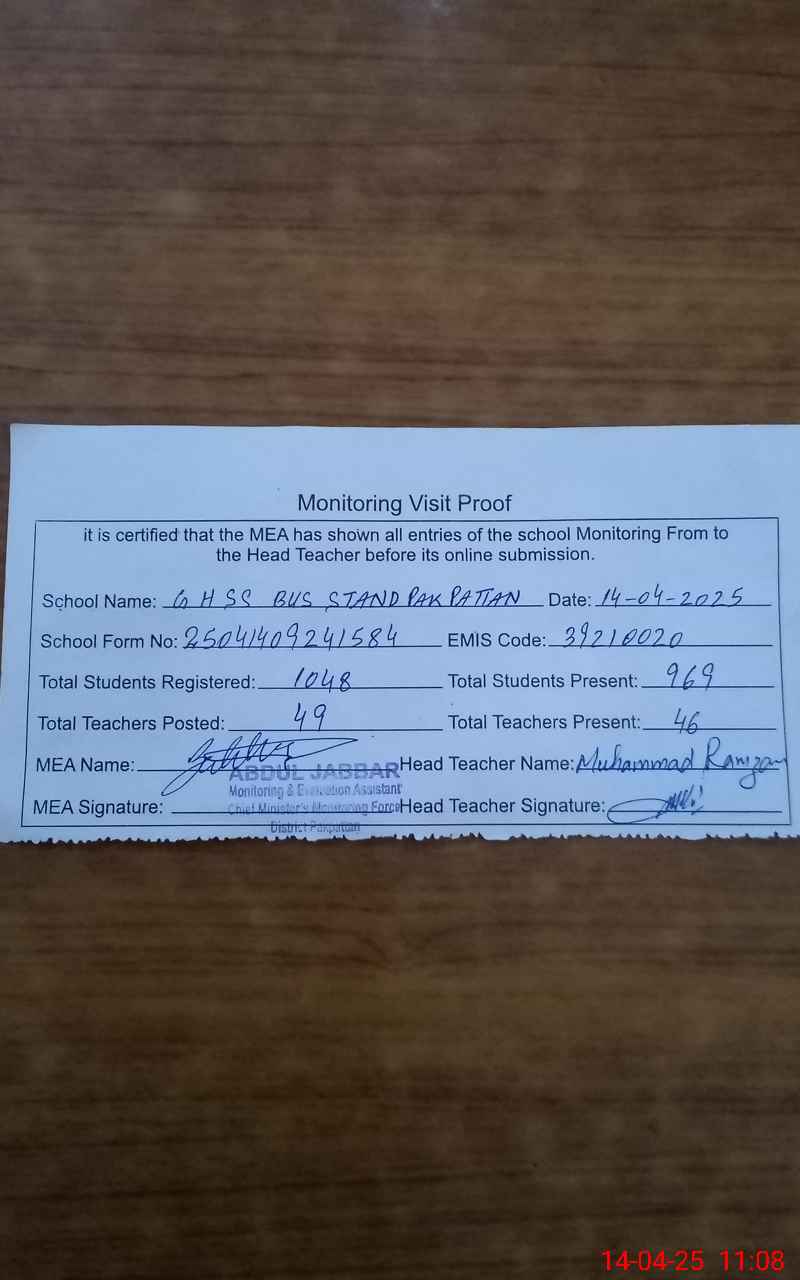 | EMIS Code: 39210020 | Name of School: GHSS BUS STAND PAKPATTAN | |||